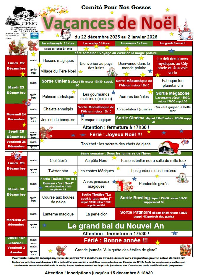 Le CPNG accueillera vos enfants du 22 décembre 2025 au 2 janvier 2026 pour les vacances de Noël.
